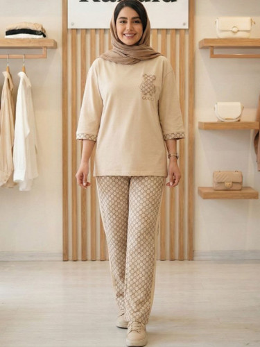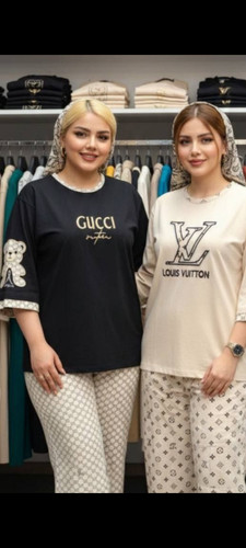 تیشرت شلوار زنانه قواره دار نخ پنبه اعلا طرح گوچی و لویی ویتون استین سه ربع و شلوار جیب کاربردی داره ابروی و پرزدهی نداره مناسب سایز ۴۰ تا ۵۲